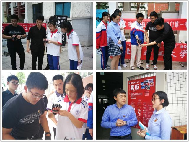 管理學院“北理領航”人分別走訪了廈門外國語學校、廈門第一中學和廈門雙十中學,親自將2018年北京理工大學錄取喜報送到各中學教務處主任的手中;“相約北理”校園開放日活動,也受到了這三所中學的高度重視和熱烈歡迎。此次活動獲得我校機電學院及其大學生創新團隊的大力支持,剛剛在第十一屆全國大學生創新創業年會獲得“最佳創意項目”和“我最喜愛的項目”兩項獎項、機電學院特殊機器人創新團隊“基于ROS系統的多功能仿蛛足輪多用途機器人”走進中學校園,憑借炫酷的外表、創新的理念、強大的功能吸引了眾多中學生的駐足圍觀,中學生或與團隊成員進行交流討論,或親自操控機器人感受科創作品的魅力與快樂。現場參與活動的中學師生紛紛通過新媒體轉發和分享開放日活動帶給他們的感受,表達出對北理工科技創新能力和人才培養工作的認同。
