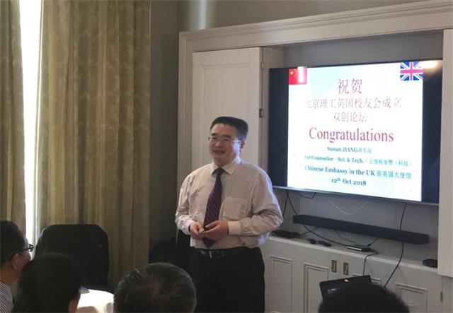 成立大會后,北京理工大學英國校友會創新與發展論壇順利舉行。駐英國大使館科技公參蔣蘇南致辭,他對北京理工大學英國校友會的成立表示祝賀,并作“中英科技發展與創新的機遇”的主題報告。