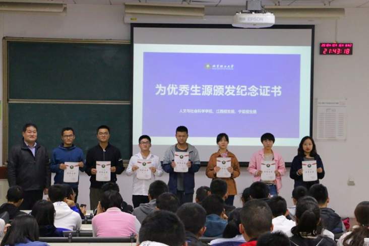 “北理領(lǐng)航人”代表還為全體新生頒發(fā)了招生組制作的“優(yōu)秀生源”紀(jì)念證書。招生組建立專門微信群以加強(qiáng)與新生的交流和跟蹤,便于更好的推動(dòng)學(xué)校招生宣傳政策的實(shí)施及“思源計(jì)劃”的實(shí)施。 招生組也將繼續(xù)創(chuàng)新工作,不斷搭建溝通交流平臺(tái),提升生源質(zhì)量,統(tǒng)籌落實(shí)學(xué)校“北理領(lǐng)航人”及“北理講堂”制度,吸引更多優(yōu)質(zhì)生源。