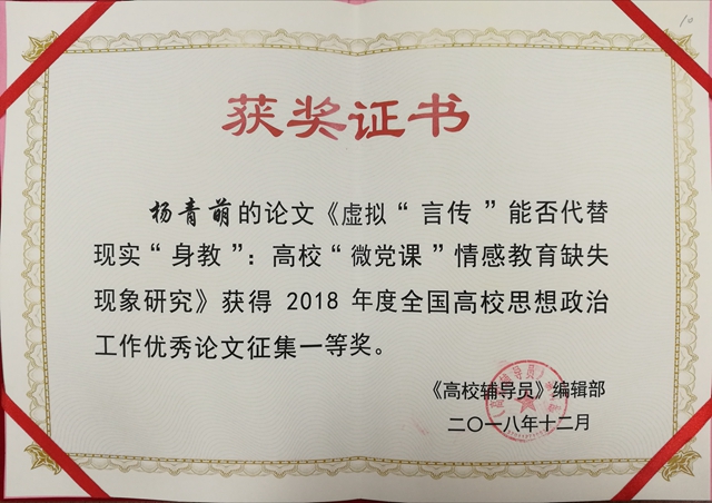 在2018年度全國高校思想政治工作優秀論文征集活動中,楊青萌撰寫的論文《虛擬“言傳”能否代替現實“身教”:高校“微黨課”情感教育缺失現象研究》,榮獲一等獎。全國高校思想政治工作優秀論文征集活動由教育部思想政治工作司指導,面向全國高校輔導員開展,經專家匿名評審,共評出優秀論文97篇,其中一等獎19篇,二等獎32篇,三等獎46篇,獲獎論文第一作者受邀參加第十屆全國高校輔導員工作創新論壇。論壇由中國高等教育學會輔導員工作研究分會主辦,浙江大學承辦,以“深入學習貫徹習近平新時代中國特色社會主義思想,德智體美勞五育并舉,培養擔當民族復興大任的時代新人”為主題,高等教育領域專家及來自各?。▍^)的優秀輔導員代表等200余人,圍繞論壇主題進行交流研討。