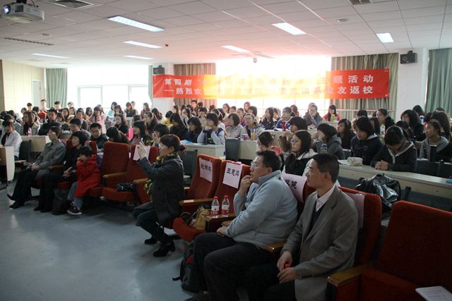 校友紀紅,目前就職于Taylor&Francis公司,從事銷售經理工作。她和同學們分享了自己從事編輯和圖書銷售的經歷,鼓勵同學們珍惜大學時光,在大學要多讀書、讀好書。校友翟欣,目前就職于澳大利亞駐華使館,從事翻譯工作。她在出版社及加拿大等駐華大使館的工作經歷讓同學們敬佩有加,她鼓勵同學們要刻苦學習,慎獨律己,在浮華的社會中保持一顆平靜的內心,認真學習專業知識,發揮專業所長,報效社會和國家。校友趙星,目前就職于中國農業大學英語系。趙星老師以自己托福滿分的經歷告訴同學們學習語言的重要性,并且現場傳授了學好語言的方法和技巧,以期對學弟學妹們有所幫助。校友范麗萍,目前就職于匯佳職業學校,她從學習的心態出發,告訴同學們快樂大學的真諦。校友蔡健,目前就職于Google公司,做項目經理,他以自己豐富的工作閱歷向同學們傳授職場之道,鼓勵同學們奮發前行,使廣大同學受益匪淺。校友劉濤,目前就職于明思力公共關系公司。他以自己成功轉型為例,從自己在公共關系公選課學習經歷說起,告訴同學們在學習語言的同時,要注重其他學科知識的儲備和能力的培養。校友邢清清,目前是我校國際交流合作處副處長,也是我院英語系老師。她熱情地向同學們介紹了北京理工大學為同學們提供的豐富的留學資源,以及與我校關系密切的兩所孔子學院的相關事宜,引起同學們極大的興趣,她也告誡大家凡事要早著手、早規劃、早準備。