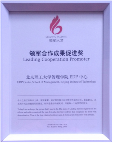北京理工大學管理與經濟學院EDP中心、武漢大學領軍人才項目辦公室、廈門大學管理學院EDP中心榮獲“領軍合作成果促進獎”,該獎項是此次大會頒發的唯一集體榮譽獎。董沛武副院長代表我校上臺領獎,并發表獲獎感言。我校學員河南潤南漆業有限公司董事長石建超榮獲“領軍貢獻獎”、河南毅達電氣科技有限公司總經理李國治榮獲“優秀領軍學員獎”。