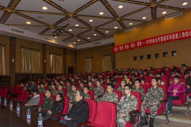 卜金寶老師結(jié)合自己11年的采訪經(jīng)歷,從忠誠(chéng)、堅(jiān)韌、敬業(yè)、豁達(dá)、感恩等5個(gè)方面,通過(guò)大量珍貴的采訪視頻片段,聲情并茂地介紹了曾拜訪過(guò)的300余位開(kāi)國(guó)將軍和英模人物中的部分感人故事。展示了軍人老前輩的激情歲月和輝煌人生,與師生共同探討百位開(kāi)國(guó)將軍成功之路,勉勵(lì)大家珍惜今日美好時(shí)光,他日成為祖國(guó)棟梁。