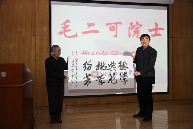 隨后,北京理工大學黨委書記郭大成教授講話。郭書記高度評價了毛二可院士的人生成就和人格魅力,并為毛二可院士贈送個人手書“德學典范 桃李芬芳”。