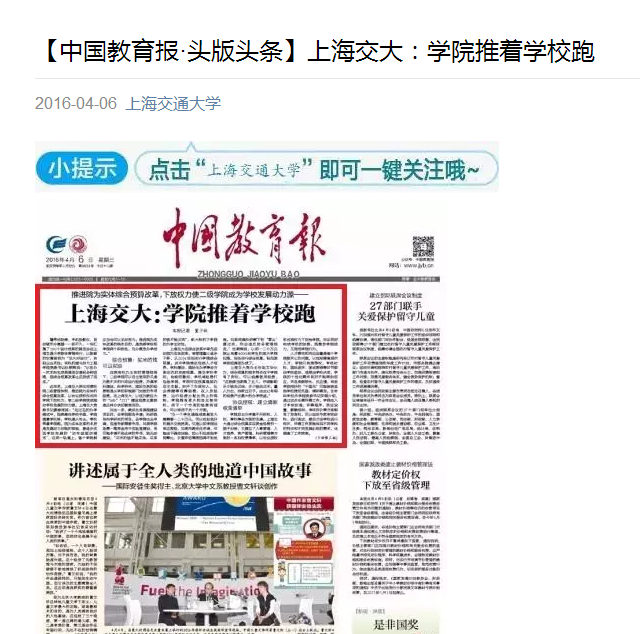 原文標題:【中國教育報·頭版頭條】上海交大:學院推著學校跑
