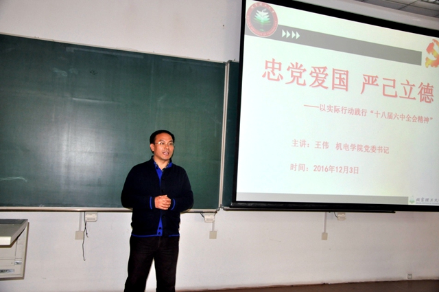 2016年12月3日下午,機電學(xué)院于研究生樓302教室開展了“兩學(xué)一做——忠黨愛國,嚴己立德”主題黨課,學(xué)院黨委書記王偉主講,副院長、副書記陳軍,學(xué)院全體輔導(dǎo)員,150余名入黨積極分子及學(xué)生干部參加了活動。