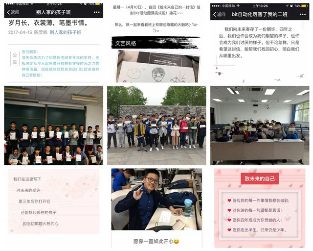 2017年4月,在學院的積極引導和組織下,學院16級各班級形成了以班委為表率、全班同學共同參與的德育開題隊伍力量。班委積極組織動員學生為德育工作出謀劃策,同學們精心策劃形式多樣的德育開題實踐活動。通過班主任、輔導員、班委以及同學們的分享討論,學院組織開展了主題為“寫給未來的一封信”的德育實踐活動,引導學生樹立大學目標,清晰人生規劃。在活動過程中,同學們進行了信封的精心設計和裝飾,展示了班級風采,彰顯了學生個性。06111603班有同學在信中提到,目標是行為的指向標和動力,目標的樹立對人生的發展具有重要的作用。信件書寫和信封設計活動開展后,同學們以班級為單位在“未來驛站”投遞信件。整個活動設計形式新穎,內容豐富,彰顯學生個性與智慧,也承載了同學們對夢想的寄托。自開展以來,學院16級本科生的德育實踐活動取得了良好的效果。