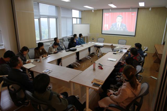 聆聽完莊嚴的國歌之后,學院師生認真觀看開幕會并學習習主席報告講話。大會上,習主席提出了“四個新”---新時代、新思想、新目標、新征程---的國家發展理念,和“四個偉大”---更有能力和信心實現民族復興、實現偉大夢想必須進行偉大斗爭、必須建設偉大工程、必須推進偉大事業---的黨的奮斗方向。聽完習主席的報告,大家備感振奮,均躍躍欲試,表示將在今后的工作中廣泛宣傳、全面貫徹、認真踐行黨的十九大報告精神,堅定信念跟黨走,不忘初心謀發展、齊心合力加油干,將以更飽滿的工作熱情、更踏實的工作態度,克難攻堅、努力奮進,矢志不渝地在新時代創造新輝煌。