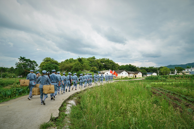 全體參訓學員前往中央紅軍出發地——云石山,開展《重走長征出發路》的體驗教學,學員們身著紅軍服,背起刀槍,挑起扁擔,吹響軍號,從紅軍長征的起點出發,穿過農田鄉村,通過重走長征出發路,身臨其境,感悟“初心之路”。在行軍中,學員們還開展了挑糧競賽、學唱紅軍歌曲、“飛奪瀘定橋”等互動體驗環節。在贛南的烈日下,紅軍服被汗水完全浸透,但學員們全程精神昂揚地登上了云石山。