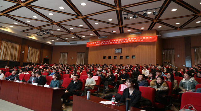 編輯:王笑竹 審核:顏志軍 彭明雪 閱讀次數:為進一步貫徹落實學校“不忘初心、牢記使命”主題教育和全面從嚴治黨工作要求,進一步加強學生黨員教育培養,提高學生黨建工作質量,1月5日,管理學院“不忘初心 牢記使命”主題教育專題黨課暨學生黨員承諾書簽訂儀式在七號樓報告廳舉行。學校黨建專家徐其敏、管理學院黨委書記顏志軍出席活動,包括2019年下半年發展的102名預備黨員在內的近200名學生黨員、黨建組織員、輔導員參加活動。活動包括黨課講授、集體宣誓、佩帶黨徽、黨員代表發言、黨員承諾書簽訂等環節。
