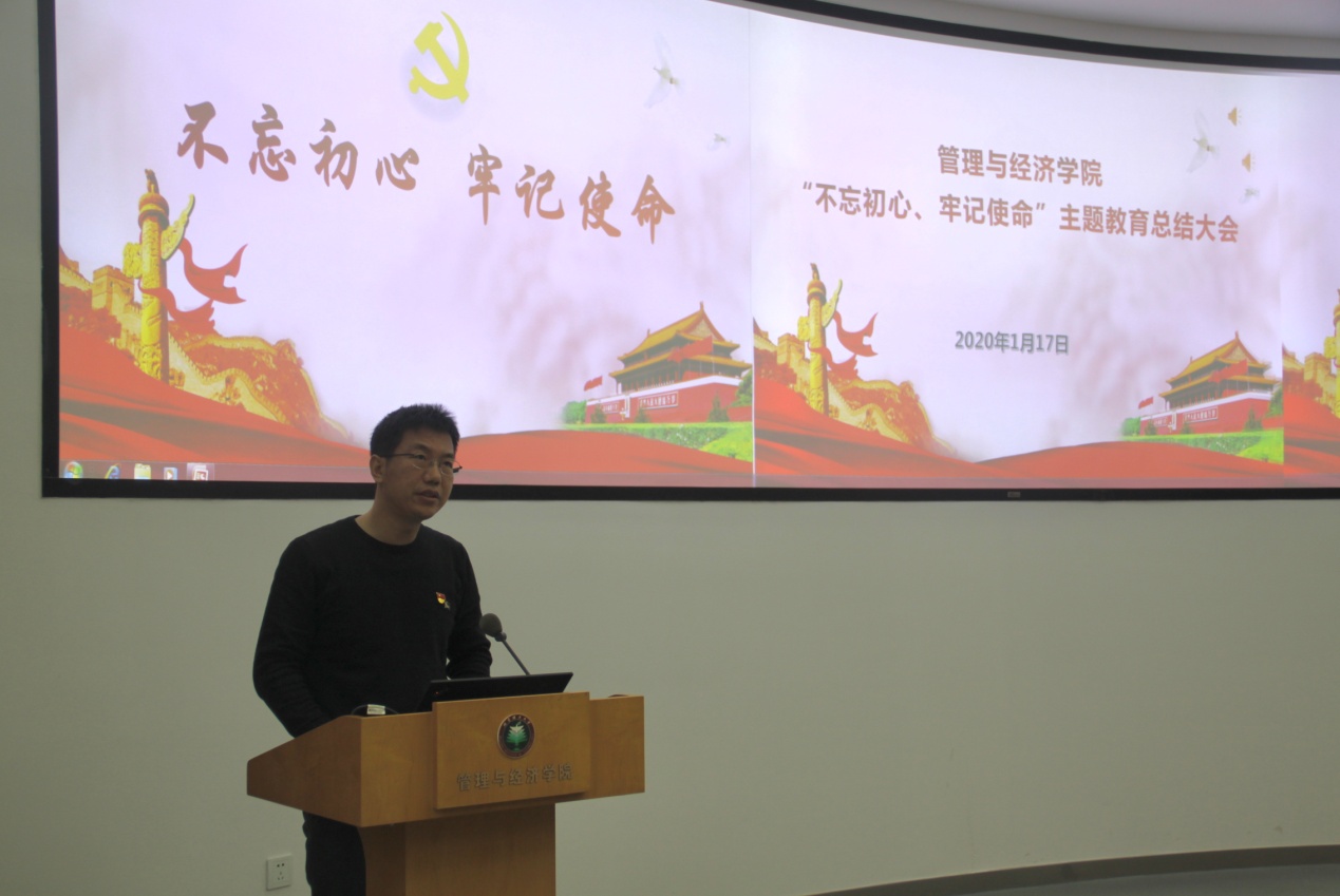學(xué)院黨委書記顏志軍做總結(jié)報(bào)告。他從五個(gè)“緊”字出發(fā),總結(jié)了管理與經(jīng)濟(jì)學(xué)院主題教育的做法和成效:一是緊跟上級(jí)精神,堅(jiān)持步調(diào)一致,做到確保標(biāo)準(zhǔn),務(wù)實(shí)求效;二是緊扣主題主線,堅(jiān)持學(xué)深學(xué)透,做到融會(huì)貫通、學(xué)以致用;三是緊貼工作實(shí)際,堅(jiān)持深入調(diào)研,做到求真務(wù)實(shí)、更接地氣;四是緊抓檢視問(wèn)題,堅(jiān)持深挖細(xì)查,做到刀刃向內(nèi),自我革命;五是緊推整改整治,堅(jiān)持真抓真改,做到即知即改、立行立改。通過(guò)主題教育的深入開(kāi)展,學(xué)院已取得了階段性整改成果,也更加深刻地認(rèn)識(shí)到主題教育是新時(shí)代深化黨的自我革命、推動(dòng)全面從嚴(yán)治黨向縱深發(fā)展的生動(dòng)實(shí)踐,具有重大的現(xiàn)實(shí)意義和歷史意義。而踐行黨的初心使命,落實(shí)到建設(shè)新時(shí)代中國(guó)特色世界一流大學(xué)的辦學(xué)實(shí)踐中,就是不斷堅(jiān)持“為黨育才、為國(guó)育人”,以實(shí)實(shí)在在的發(fā)展成果推動(dòng)學(xué)院發(fā)展不斷取得新的成績(jī)。