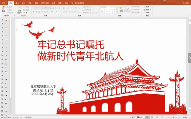 北航航空學院學生黨員曲星遠、王子儀分享了“牢記總書記囑托,做新時代青年北航人”主題微黨課,展現了青年北航人在社區戰“疫”、學研戰“疫”和宣傳戰“疫”三個方面的出色表現。