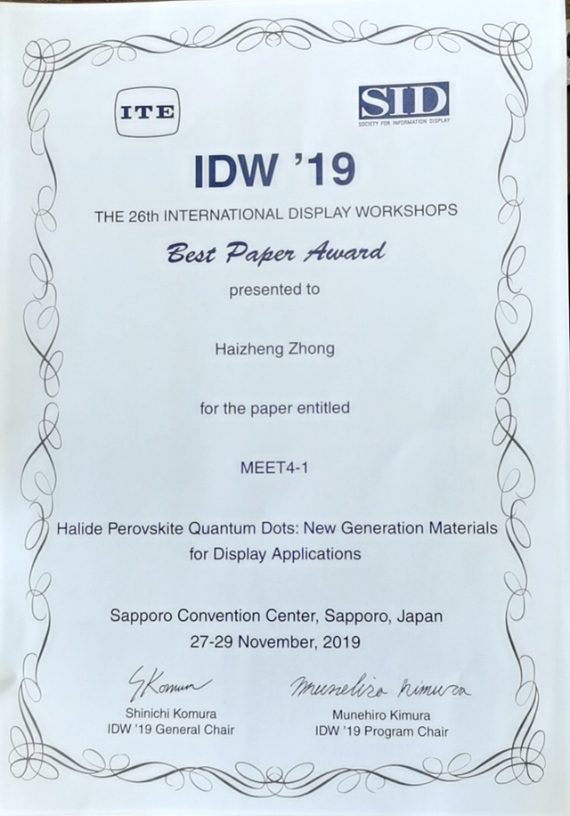 北理工鐘海政教授獲得日本IDW 2019顯示會(huì)議最佳論文獎(jiǎng)