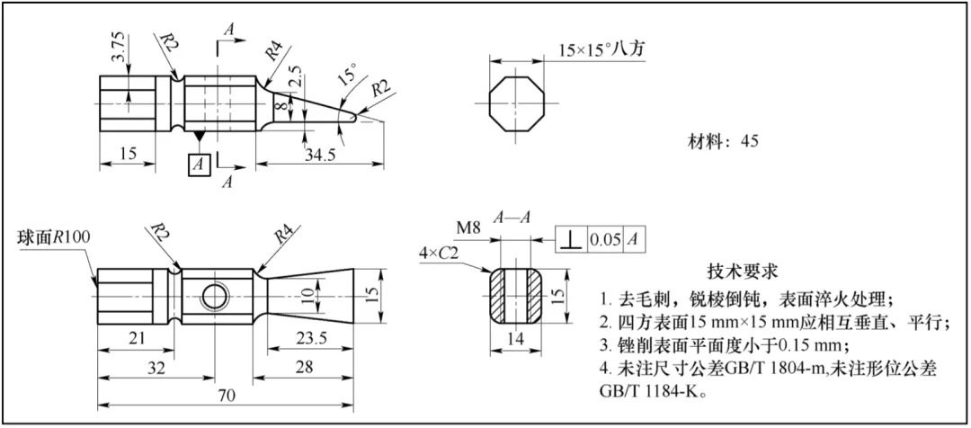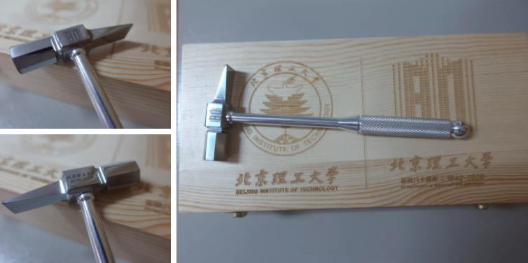 錘柄為鋁合金材質,歷經下料、 車端面、車外圓、車錐面、車螺紋、車球頭以及滾花等工藝過程;錘頭為45鋼材質,歷經劃線、鋸削、銼削、鉆孔、攻絲、表面淬火處理等工藝過程;錘頭兩側采用激光雕刻技術分別刻有八十周年校慶標志和“北京理工大學建校八十周年”字樣,以此體現學校八十載實踐育人成就,弘揚“精工”品格。