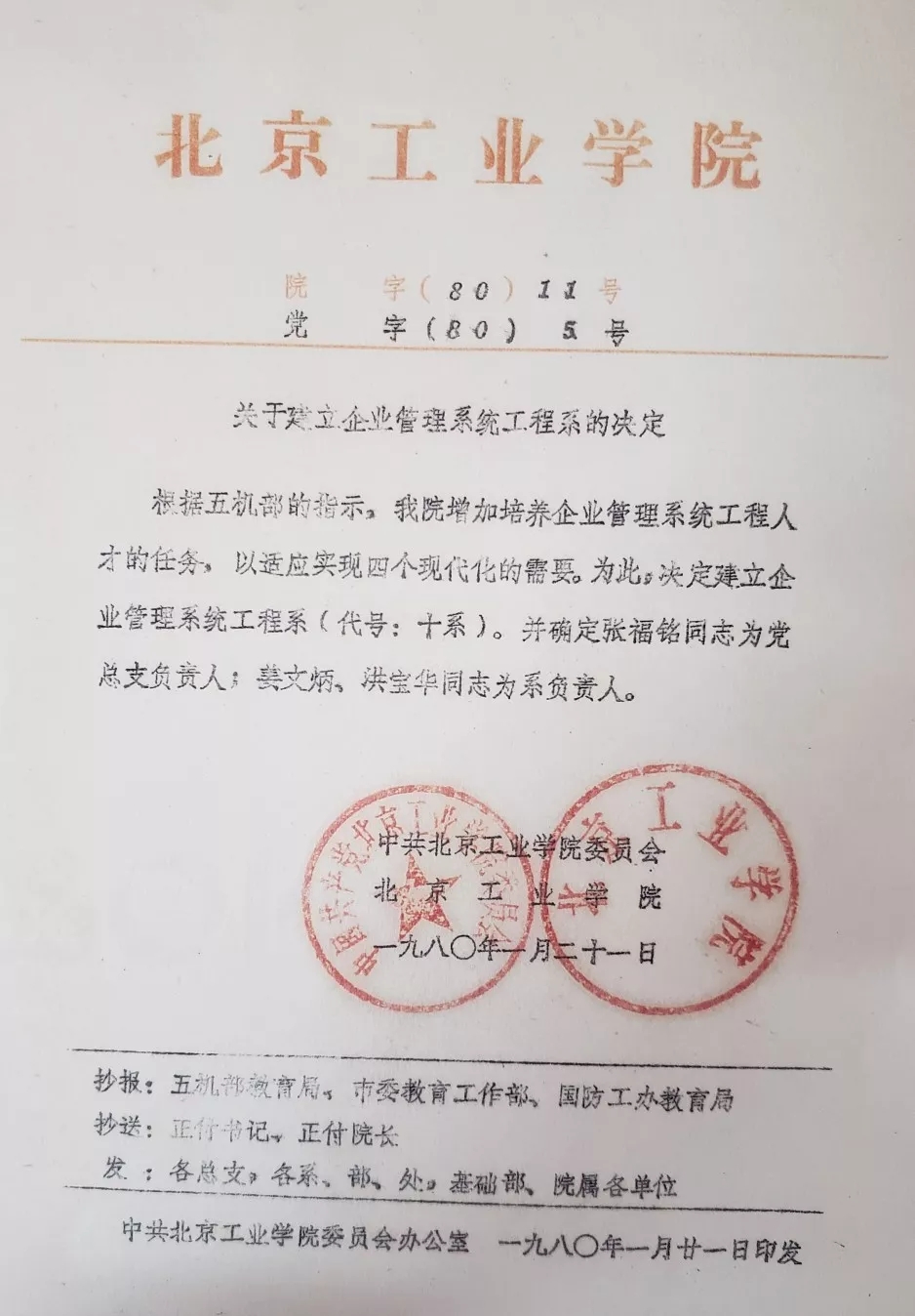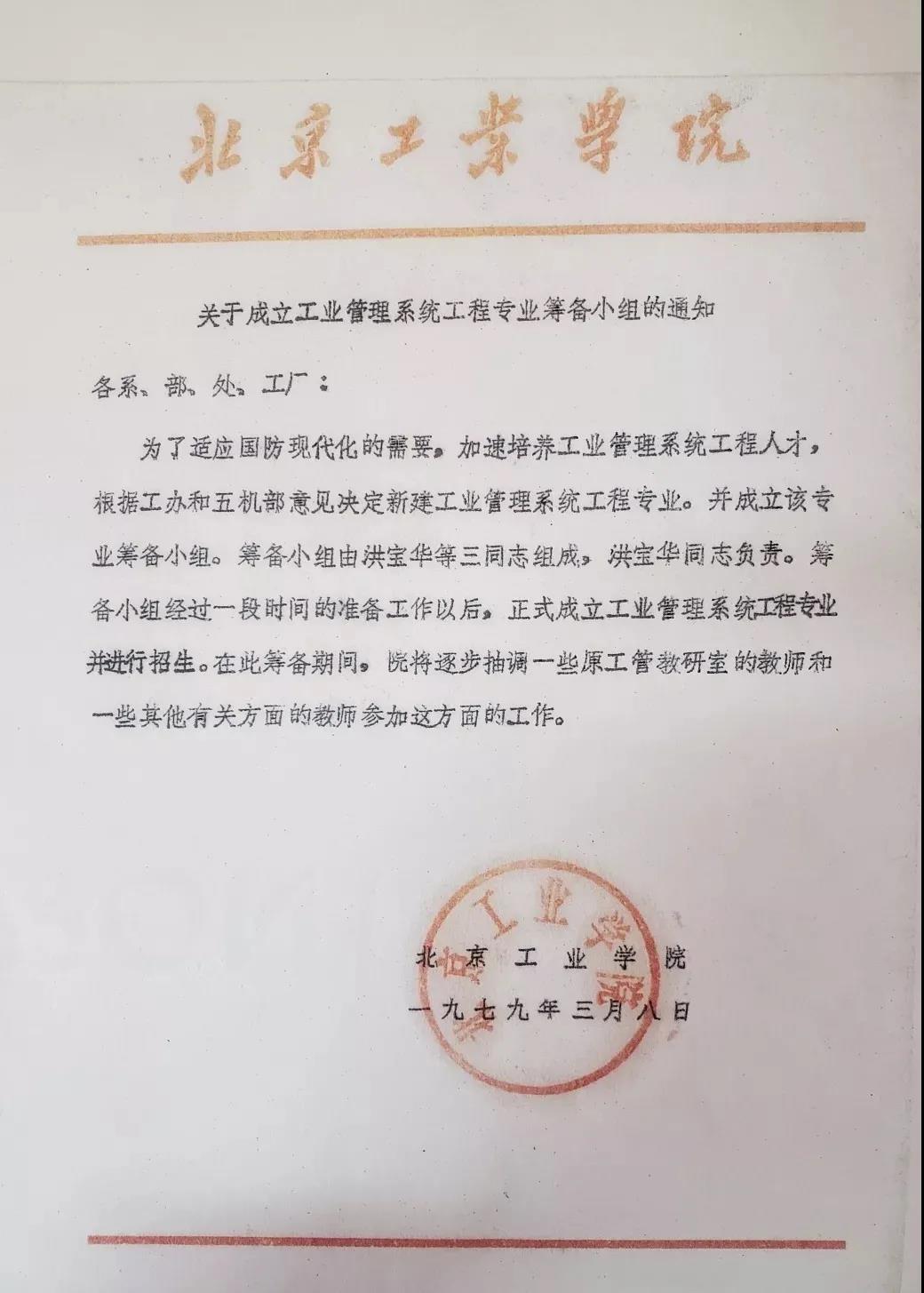 “改革開放以后,不僅要重視技術,也要重視管理,管理是在發展,我想去開拓一個新的領域。”在一番思想斗爭之后,管理科學的吸引力讓43歲的郎志正做出了“改行”的決定,他決定加入管理系。經過一批“創系元老”的努力,1979年底,管理系成立的條件基本成熟了。1980年1月,經第五工業機械部批準,學校正式下發文件,決定成立企業管理系統工程系(即管理工程系),姜文炳同志為行政負責人。