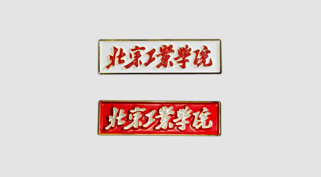 在徽章套件中,首先是兩枚“北京工業學院”的長方形校名牌,校名由蒼勁有力的毛體字書寫,白底紅字和紅底白字兩款,當時分別發放學生與教師佩戴。1952年,學校更名為北京工業學院,并成為新中國第一所國防工業院校,在胸前佩戴“京工”校名牌是每位師生最自豪的榮光,輝煌的“京工歲月”融入小小的徽章之中。