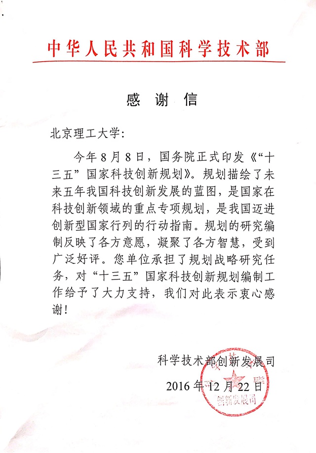 近日,國家科學技術部向北京理工大學發來感謝信,感謝北理工對《“十三五”國家科技創新規劃》編制工作給予的大力支持。 2016年...