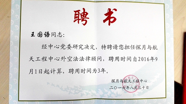 國防科工局探月航天工程中心(中心)聘請法學院王國語副教授為外空法法律顧問,2016年9月18日,王國語應邀參加了中心的聘用儀式。