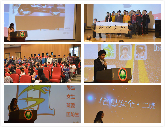 隨后是本科2011級信息安全一班團支部(08311102團支部)的班級代表左麗娟同學進行展示。左麗娟同學以較為獨特的視頻展示了本班同學們團結向上,不斷進取的良好風貌,之后介紹了本班獨特的班徽設計,同時以“聚是一團火,散作滿天星”的理念進行闡述,體現了大家學習和科技創新方面的優秀品質以及大家團結協作、一起前行的溫馨氛圍。最后大家通過大聲喊出本班的口號來結束本次演講,贏得了一陣陣熱烈的掌聲。