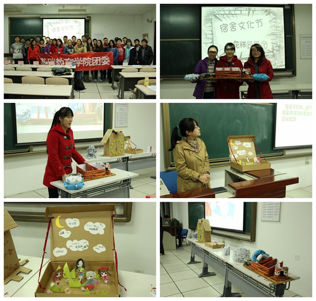 此次宿舍文化節的主題是:樂成一家,We are together,活動共包括“情誼飛長,青春由我” ----宿舍展示大賽,“炫我挑戰,揮劍爭鋒” ---寢室吉尼斯 ,“創意靈動,型秀自由” ---花樣DIY,“精彩點滴,和韻生活”---“在北理,我想說”四個部分,活動從11月2日報名開始至12月7日為止,歷時一個多月,參與報名宿舍多達100個,其中僅基礎教育學院報名參與宿舍85個,占整個活動宿舍比例的85%。宿舍展示大賽從宿舍文明方面入手,主要包括寢室的口號、寢室美化的照片、視頻及宿舍集體生活照等從多方面展示學生宿舍風貌。寢室吉尼斯則是要求以宿舍為單位來申報你認為的宿舍之最,如宿舍四人上一學年或學期獲得各種獎學金總和最多的男生和女生寢室,身高總和最大及最小的男生和女生寢室等。花樣DIY則是從低碳環保、團結、創新的角度入手,共分兩次活動開展,第一次活動由組織方為參賽選手提供材料(平時喝水用的廢舊紙杯、普通大頭針),并在專業老師的指導下,教選手們制作精美的手工藝品,選手們熱情高漲,認真學習著每個步驟,然后由評委根據作品選出入圍寢室;第二次活動則由參賽選手根據比賽要求,利用自己宿舍的廢舊物品進行制作并進行現場展示和答辯;在隨后的現場答辯環節,很多同學表示此次宿舍文化節不僅給了他們一個展示自己宿舍文化的良好平臺,更增進了舍友之間的感情,他們為了完成一件作品,宿舍四人集體合作,可能會因其中某個環節的問題爭論的面紅耳赤,但最終還是在集體智慧下將問題解決的那份欣喜是那樣的難能可貴。最終靜C305宿舍在此次“花樣DIY”中奪得桂冠,他們制作的是一個適合宿舍使用的綜合收納,作品美觀且實用性強,由于作品都是利用廢舊毛巾和紙殼制作而成、不具有防水性,他們經過共同努力解決此項技術難題,將收納盒底部粘上廢舊的光盤,這樣既堅固耐用又美觀大方;另外一個名叫“小蘋果奇緣”的作品,給評委們留下了深刻的印象,這個作品是以宿舍四人的卡通形象為素材,利用平時收快遞的廢舊紙盒,將每個人的性格特征通過作品展現出來,此作品取名為“小蘋果奇緣”,旨在道出“在這個小蘋果泛濫的年代,都希望我們能找到屬于自己的老菠蘿”。 在北理,我想說,則是給同學們一個展示內心世界的機會,以個人為單位,訴說自己的內心想法,可以將你想說的話通過三行詩、微博體等各種形式表達出來,訴說的對象可以是宿舍室友、宿舍樓管阿姨或者班級同學、老師等,同學們都積極踴躍參加,將自己的想法表達了出來,獲得了預期的效果。
