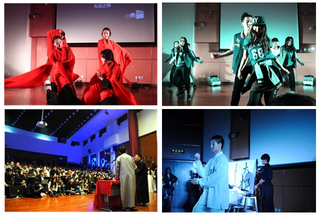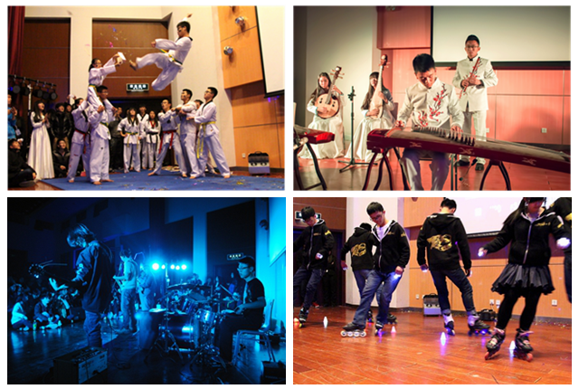 隨后,社團表演正式亮相,從黑白漫畫社炫酷搞笑的《時光 未央》,到相聲社爆笑的《出口成章》,到飛嬈古風社唯美的《禮儀之邦》,逐漸將氣氛推向高潮;武術協會和無陽齋書畫社聯合呈現的《筆墨武林》,以入木三分的即興書法為背景,行云流水地展現了傳統武術的柔風勁骨,同時,特邀峨眉拳大師及弟子現場演示的峨眉拳,讓同學們領略到了武術的極致魅力;鄉琴協會一曲《Rocking your heart》狂野搖滾,讓大家的心都似乎跟著節奏跳動;抖之道空竹社《空竹炫舞》讓抖動的空竹舞出了絢麗和華美。
