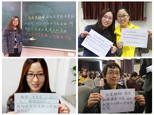 在“代言”活動中,學院全體團員青年以社會主義核心價值觀的24字為基本內容,用當下流行的“價值觀體”寫下了自己對社會主義核心價值觀的理解,用自己的行動為社會主義核心價值觀做代言。數百名團員青年的代言照片被制作成巨幅海報,營造了良好的學習氛圍。在代言的過程中,團員青年對社會主義價值觀的理解更加深入,也深刻的感受到了當代大學生的使命感和責任感。