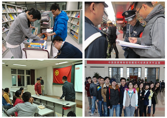 在“踐行” 活動中,各團支部通過探訪典型人物、走進社區開展各種愛心公益活動以及開展傳統文化主題講座、知識競賽等具體方式,將社會主義核心價值觀落到到了實處。2014級碩士1班團支部開展了“我的核心價值觀”知識競賽,以生動的形式傳播了社會主義核心價值觀;09311202班團支部集體參觀了中國國家博物館的復興之路展覽,對我國的民族復興歷程有了深刻的認識;09311101和09221101團支部利用課余時間到學校圖書館清理占座圖書,用實際行動踐行了社會主義核心價值觀;09311201團支部進行了“關注地鐵漲價”和“關注霧霾”調研活動,同學們在魏公村等地鐵站通過問卷調查的方式調研了公眾對于地鐵漲價這一熱點話題的看法,同時,他們還在朝陽公園等對游客進行了采訪,探討霧霾對于大眾的影響。