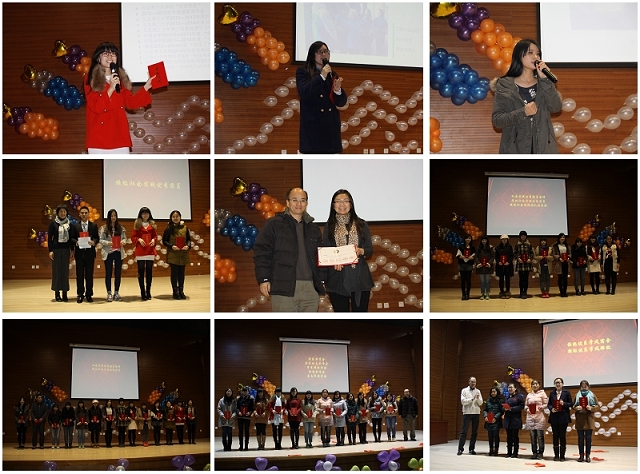 除了精彩紛呈的節(jié)目表演,為激勵(lì)同學(xué)們一年來(lái)的努力,外國(guó)語(yǔ)學(xué)院表彰大會(huì)穿插進(jìn)行。各位領(lǐng)導(dǎo)和老師為同學(xué)們一年來(lái)優(yōu)異的表現(xiàn)頒發(fā)了獎(jiǎng)狀和證書,其中有2014國(guó)家獎(jiǎng)學(xué)金及社會(huì)捐助獎(jiǎng)學(xué)金,2014暑期社會(huì)實(shí)踐獲獎(jiǎng)團(tuán)隊(duì)、帶隊(duì)教師、優(yōu)秀團(tuán)員,2014校級(jí)優(yōu)秀班級(jí)、寢室、學(xué)生標(biāo)兵、學(xué)生干部、百煉之星等。外國(guó)語(yǔ)學(xué)院榜樣庫(kù)新增優(yōu)秀學(xué)生代表11級(jí)日語(yǔ)系黃凱文、11級(jí)英語(yǔ)系許其瑞、12級(jí)德語(yǔ)系曾雪怡,分別與同學(xué)們分享了她們開展志愿服務(wù)活動(dòng)的感受、參與暑期社會(huì)實(shí)踐活動(dòng)的體會(huì)等,讓同學(xué)們?cè)诟惺芡頃?huì)熱情歡樂氣氛的同時(shí)又收獲到了知識(shí)與經(jīng)驗(yàn)。