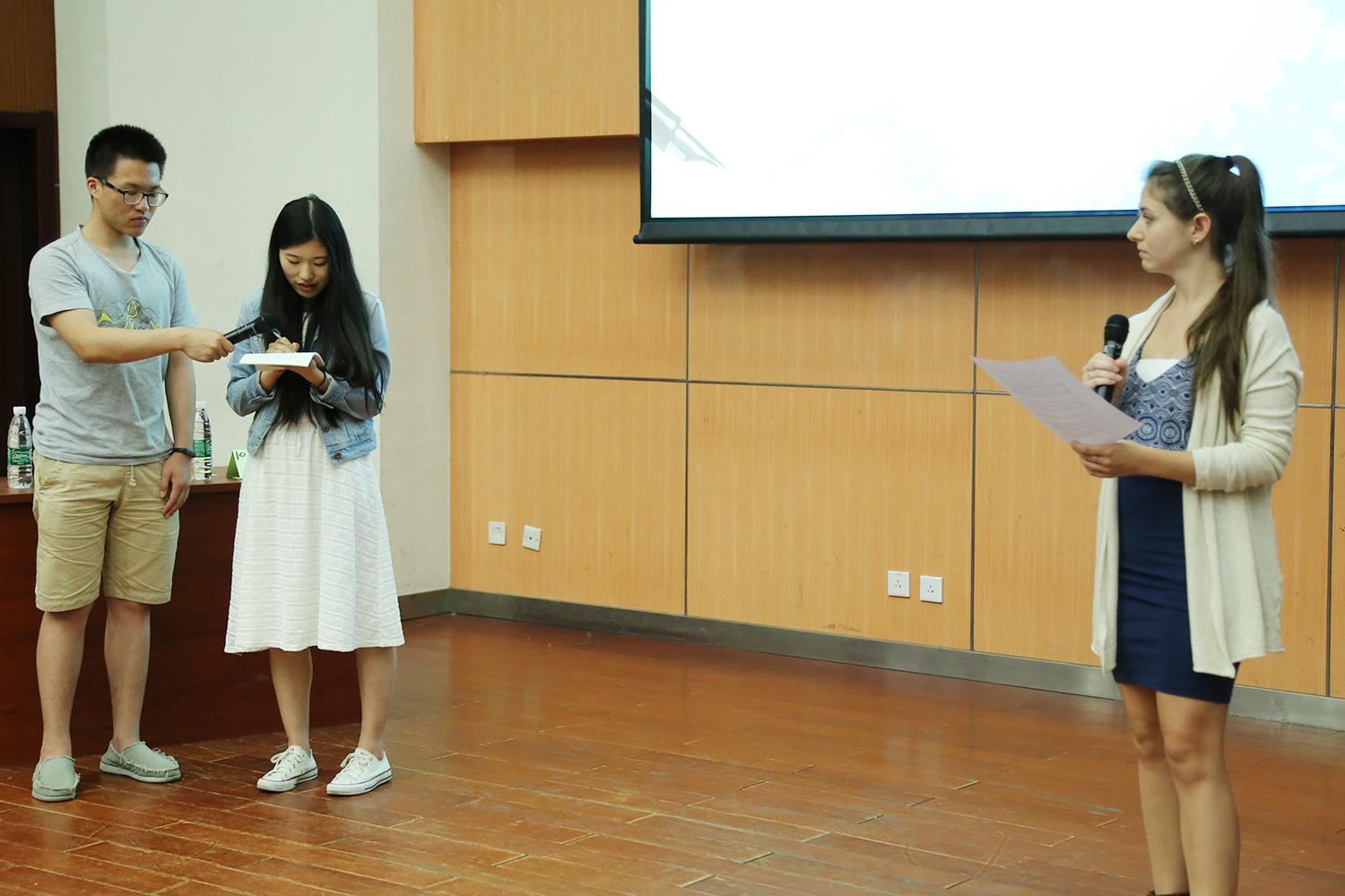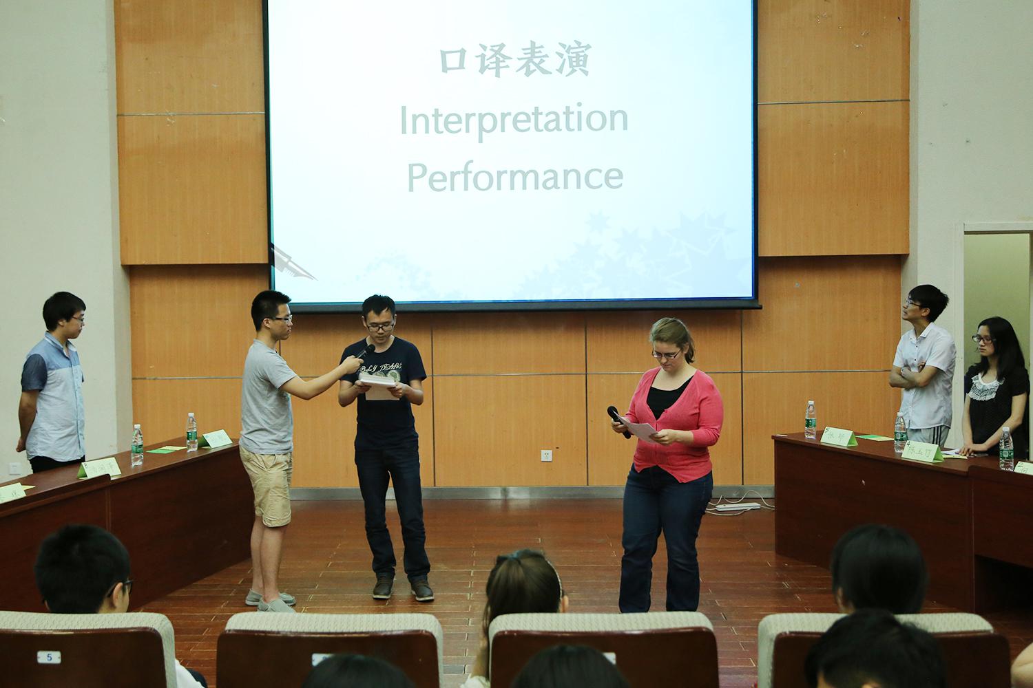 在最后一個環(huán)節(jié)比賽開始前,兩位來自翻譯專業(yè)的研究生葉芷、黎奇與兩位外教評委合作進行了精彩的口譯表演,讓現(xiàn)場觀眾們近距離感受了口譯的魅力。