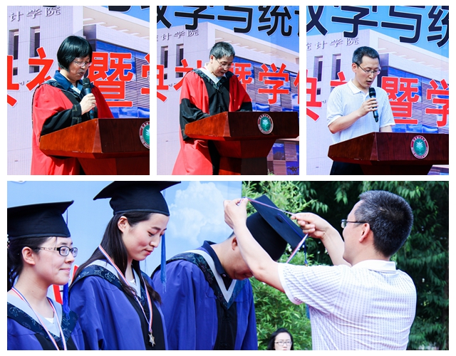 下午三時,畢業(yè)典禮暨學位授予儀式在莊嚴的國歌聲中正式開始。首先,由數(shù)學與統(tǒng)計學院院長田玉斌教授代表學院向全體畢業(yè)生致辭。田院長祝賀同學們順利畢業(yè),同時希望同學們在未來永葆身心健康,志存高遠,腳踏實地。接著副院長陳一宏教授宣讀2016屆本碩博畢業(yè)生名單,陳院長希望同學們能夠再接再厲、求實創(chuàng)新,服務(wù)祖國和人民,實現(xiàn)人生價值。之后學院黨委書記高偉濤宣讀了北京市以及校級優(yōu)秀畢業(yè)生名單,并向全體優(yōu)秀畢業(yè)生頒發(fā)榮譽證書和學院獎?wù)隆?/p>