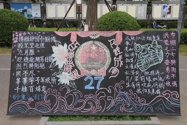 編輯:辛嘉洋 審核:徐貴寶 閱讀次數:【編者按】9月1日,為豐富軍訓生活,活躍軍營文化,加強連隊交流,展現連隊風采,北京理工大學2016年學生軍訓旅開展了板報評比活動。軍訓旅副總指揮徐貴寶、馬曉寧、茍曼莉、各團政委以及各營教導員擔任評委。各連隊學員充分發揮想象力、創造力和設計能力,用一張黑板展示他們心中的軍訓生活,用一盒粉筆勾勒橄欖綠的的青春年華。