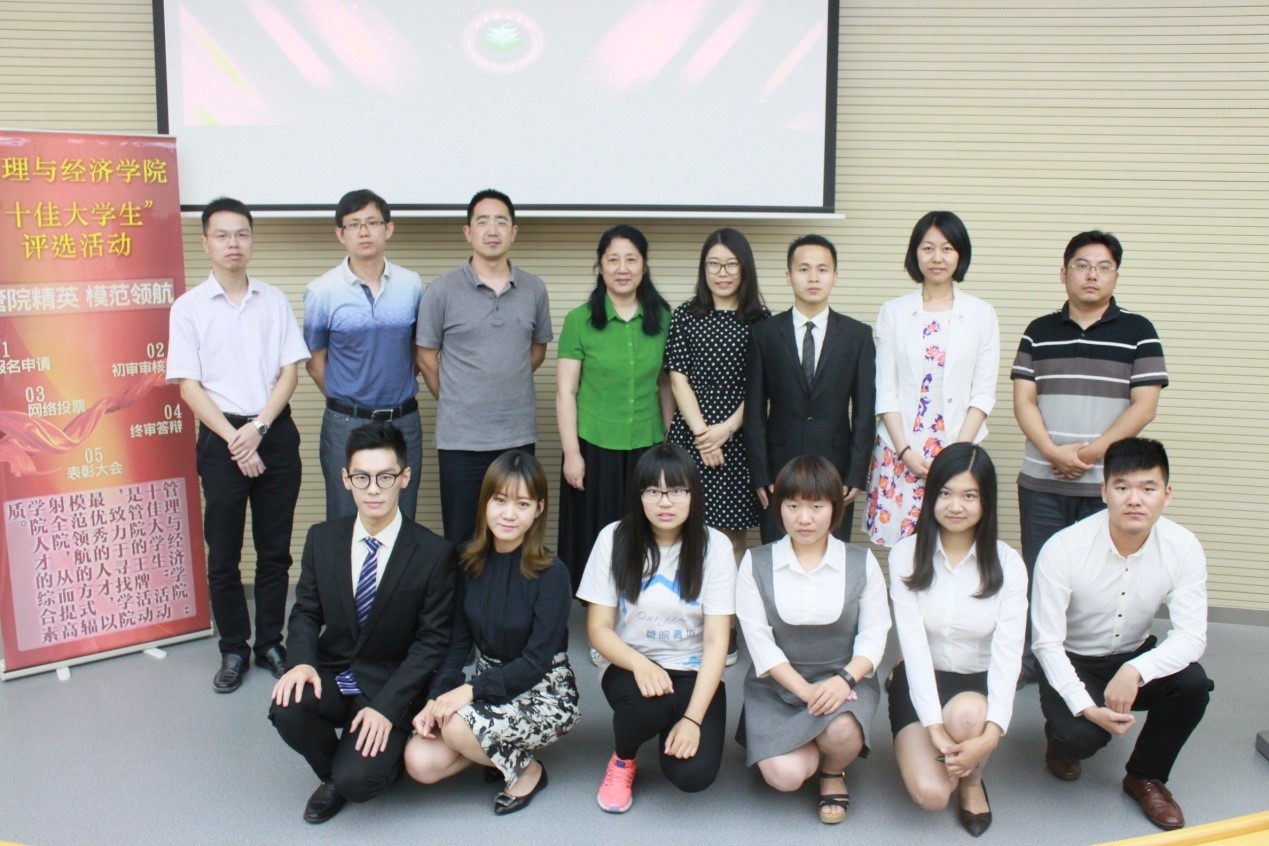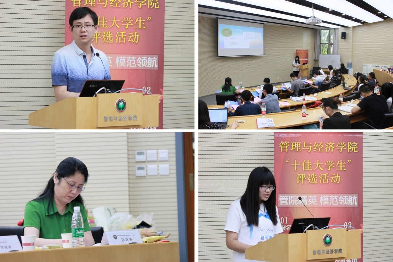 2016年4月,管理與經濟學院正式啟動以“管院精英,模范領航”為主題的2016年度“十佳大學生”評選活動。在4月初的申請階段中,大家踴躍提交申請書,向著學院最高獎項努力。5月,活動進入初審階段,“十佳大學生”評選委員會認真研究了申請人資料,完成了材料的預審與篩選,最終共有二十二位精英脫穎而出,通過初審最終晉級終審階段。2016年6月初進行了“十佳大學生”的網絡投票環節,學院在管理與經濟學院網站與微信公眾平臺上展示了候選人資料并進行了線上投票。同學們在閱讀了解候選人的事跡后,慎重地投出自己心目中認可的“十佳大學生”。