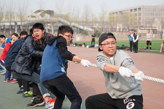 在拔河比賽中,當比賽的哨聲一響起,隊員們口中齊呼“一二,一二”,雙手緊握長繩,憋足了勁拼命往后拉,班級內其他同學自發組成啦啦隊為本班隊員加油。號子聲、吶喊聲,此起彼伏,飄蕩在整個足球場上空。最終,大二高分子二班力壓群雄,奪得桂冠。