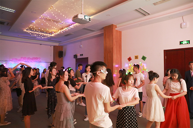 舞會的開場由鄭陽和盛雨桐兩位同學分別帶來歌曲《再不瘋狂我們就老了》和《明天,你好》,讓大家在美妙的歌聲中迅速進入舞會氣氛。之后是吳鵬、李淑寧兩位同學帶來精彩的舞蹈表演,驚艷的技藝、優美的舞步令現場掌聲不斷。經過自由搭配舞伴和舞蹈老師的耐心教學,同學們和舞伴愈加默契,舞步也熟練起來,大家跟著音樂歡快的舞動起來。中間穿插的抽獎環節以及“123看這邊”“一塊五”的小游戲使現場氣氛達到高潮。最后由張峻豪同學帶來歌曲《那些年》,讓大家在青春的歌聲中結束今晚精彩的舞會。