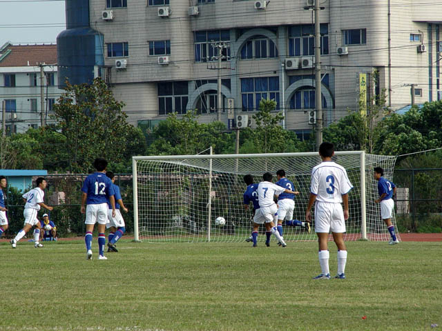 上半場比賽,上海隊拼搶比較激烈,占據了場上的主動,我方門前多次出現混戰局面,幸虧我校足球隊1號守門員孫程發揮出色,排除了險情。