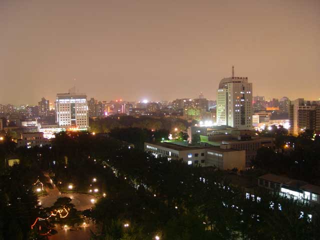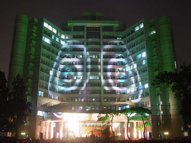 北京理工大學藝術節開幕式晚會現場把中心教學樓映襯得五彩繽紛。