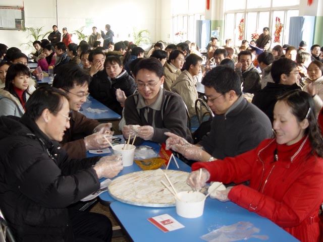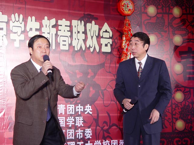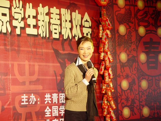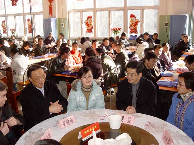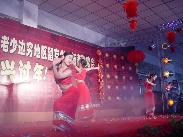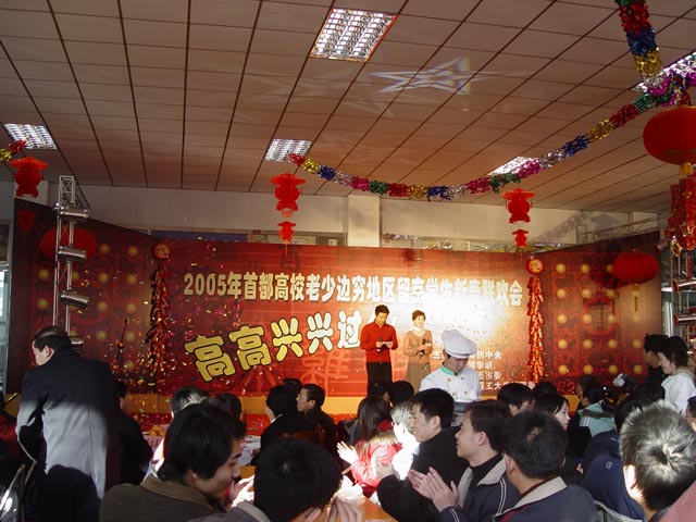 來自16所首都高校因經濟困難等原因而留在北京過年的大學生代表歡聚在北京理工大學,共度2005年新春。食堂成了一片歡樂的海洋,張燈結彩,大紅燈籠高高掛在舞臺兩側。