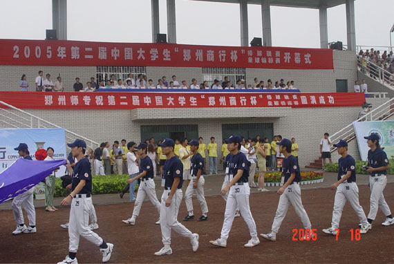 上午8:30,伴著《運動員進行曲》高亢的旋律,12名組成“品”字型旗陣的護旗手護著國旗、會旗、校旗,邁著矯健的步伐走進會場。在青春靚麗,漂亮多姿的花束隊姑娘的引導下,裁判員和來自北京大學、復旦大學、浙江大學、北京理工大學、澳門大學、香港棒球總會等27支參賽隊的運動員入場。在熱烈的氣氛中,中國大學生體育協會棒壘球分會主席、北方工業大學黨委副書記項進致開幕辭。他說,本次大賽是規模最大的棒壘球體育盛會,將極大推動我國大學生棒壘球體育事業的發展。他在講話中希望全體運動員、教練員、裁判員和工作人員本著“拼搏、團結、崛起、文明”的宗旨,遵循“更快、更高、更強”的奧林匹克精神,按照“公開、公正、公平”的競賽原則,努力賽出風格,賽出水平,把本次大賽辦成一個大團結、大歡聚的盛會,為推動大學生體育事業做出新的貢獻。中國棒球協會秘書長申偉、國家教育部學生體協聯合會秘書處競賽部部長高穎、 鄭州市副市長龔立群致賀辭,鄭州師專黨委書記于向英致歡迎辭,運動員、裁判員代表宣誓后,中共鄭州市委副書記、鄭州市市長王文超宣布本次大賽正式開幕。