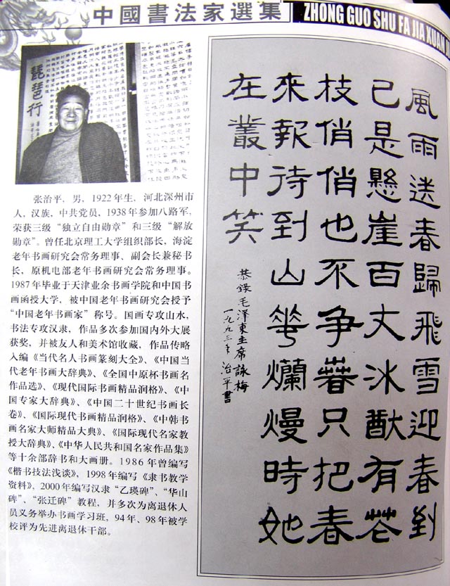 張治平先生曾任我校組織部部長,離休后專攻書法,并入選中國書法家行列。