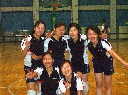 第二排左起:接應二傳陳雯(理學院應用數學系2003級本科生),副攻徐焱(機電工程學院2003級研究生),主攻詹曉燕(化工與環境學院2004級本科生),副攻李博聰(信息科學技術學院光電工程系2005級研究生)。