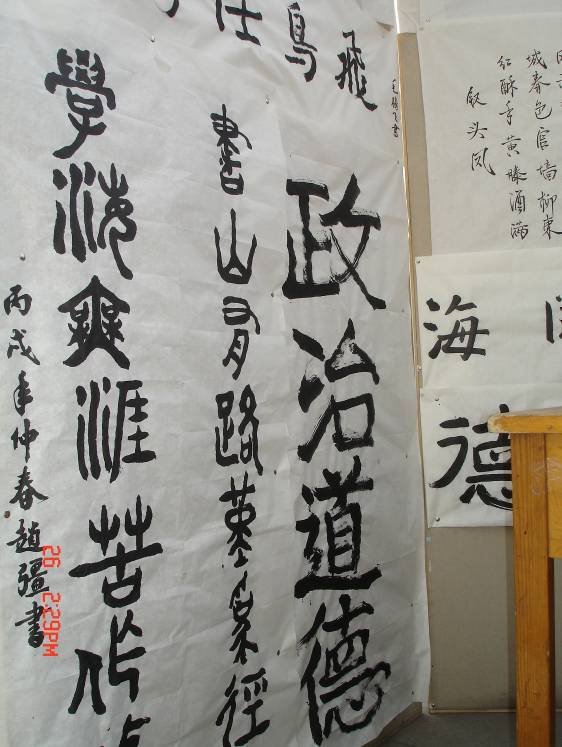 本次“校園書法展”從報名到現場揮作展示歷時十六天,此類活動可算是在摸索中嘗試繼而舉辦成功。活動舉辦之初不少同學都摩拳擦掌躍躍欲試,但在報名時又有些猶豫不決,持觀望態度。針對這樣的情況文藝部再次重申舉辦此次活動宗旨、目的及意義重在書寫內容、意在弘揚中華文化,還特別邀請來了老干部處的老書法家張治平老師為同學現場演示和指導,同時我們也請來了無陽齋書畫協會的同學們為大家作現場表演,受到了大家的熱烈歡迎。在整整一下午的書法展示過程中,共有近二十名同學先后獻藝,令圍觀的同學連連稱贊。活動之后我們將同學們的作品訂在大型展板上,激揚的文字、瀟灑的筆體,在我們和諧的校園里形成了極強的感召力。