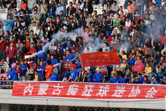 整個上半場,熱情的主場球迷不遺余力的吶喊助威,并多次掀起人浪。第40分鐘,球迷的努力終于得到回報,10號韓德名在禁區混戰中頭球首開紀錄?。?/P>