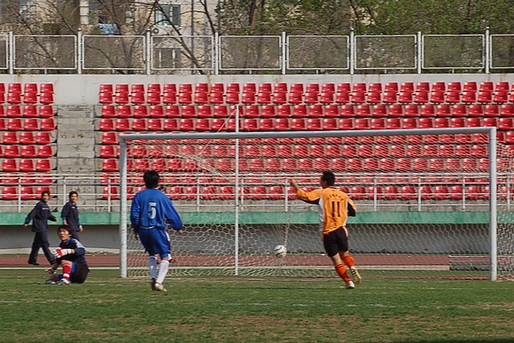 皮球劃了一道優(yōu)美的曲線,越過(guò)守門員的頭頂,直抵網(wǎng)底,比分變?yōu)?:0。