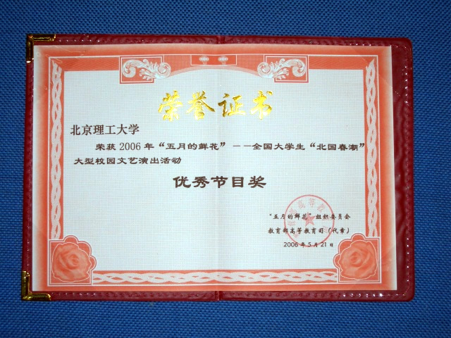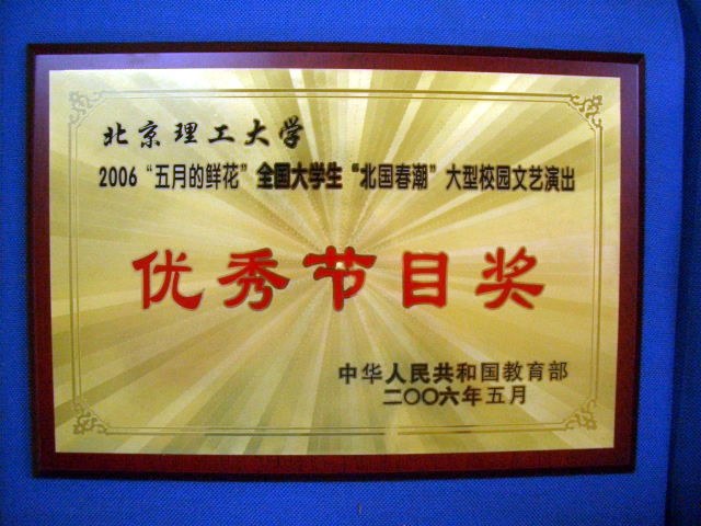 我校大學生藝術(shù)團16名同學于5月18日赴吉林省長春市吉林大學參加教育部主辦2006年"五月鮮花"——"北國春潮"大型校園文藝演出,經(jīng)過同學們的辛苦努力,我校節(jié)目獲得了優(yōu)秀節(jié)目獎。