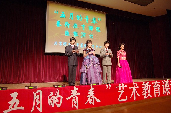 5月25日晚七點,由藝術教育中心主辦的“五月的青春——藝術教育課程匯報演出”在中心教學樓報告廳隆重舉行。北京理工大學副書記、副校長楊賓,教務處原副處長王悅音,團委書記張啟鴻,校教學指導委員會專家龔紹文、李惠生,藝術教育中心主任龐海芍、藝術總監賀春華,校園網新聞網主編段煉,教務處的田鳳琴老師,校團委的謝瀟儀老師,藝術教育中心的教師們和數百名學生一起觀看了演出。