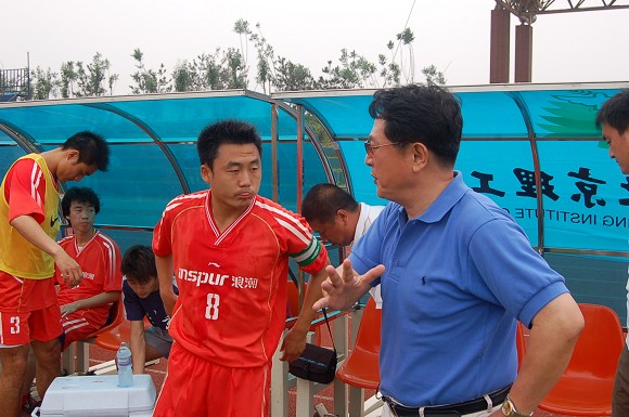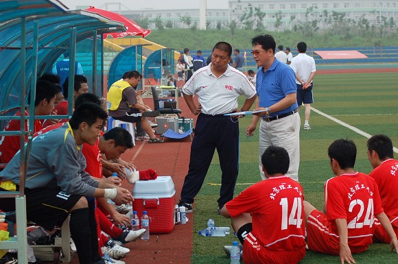 我校足球隊(duì)總教練金志揚(yáng)教授在賽前進(jìn)行戰(zhàn)術(shù)布置。