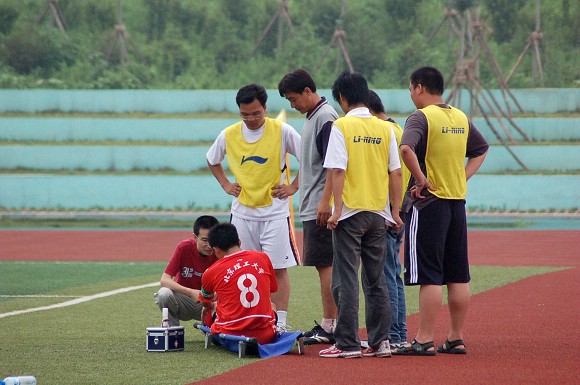 場(chǎng)上隊(duì)長8號(hào)袁微被對(duì)方鏟傷后,在場(chǎng)邊接受臨時(shí)治療。