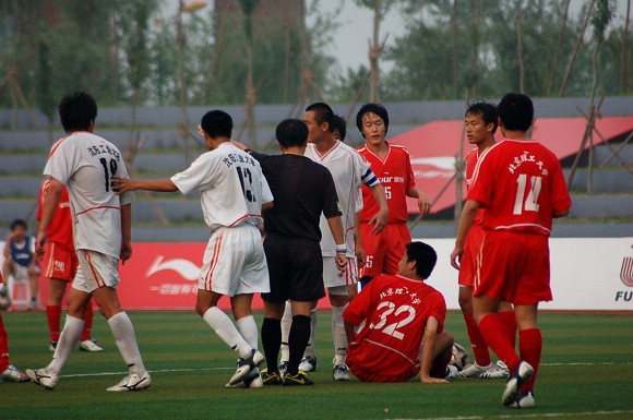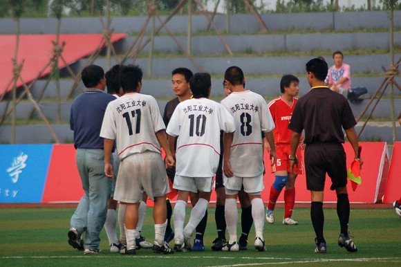 在終場(chǎng)哨聲響起比分定格之時(shí),沈陽工業(yè)大學(xué)的部分球員甚至竟然上前圍攻和謾罵裁判, 這種惡劣的球場(chǎng)不文明行為與其大學(xué)生的身份極為不配,甚至還有極個(gè)別隊(duì)員做出動(dòng)作欲毆打主裁判,幸被本隊(duì)教練攔住。此事件在比賽后,組委會(huì)經(jīng)過商討決定對(duì)沈陽工業(yè)大學(xué)足球隊(duì)進(jìn)行罰款并通報(bào)批評(píng),圍攻和謾罵主裁判的8號(hào)球員、18號(hào)球員均被禁止參加余下的兩場(chǎng)比賽。