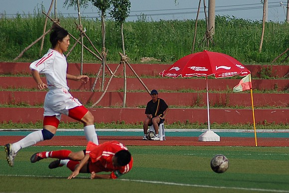 此后,袁微成了對方的緊盯熱點,第25分鐘,袁微帶球突破,在禁區前沿再次被對方絆倒,對方防守隊員被黃牌警告,我方獲任意球機會。