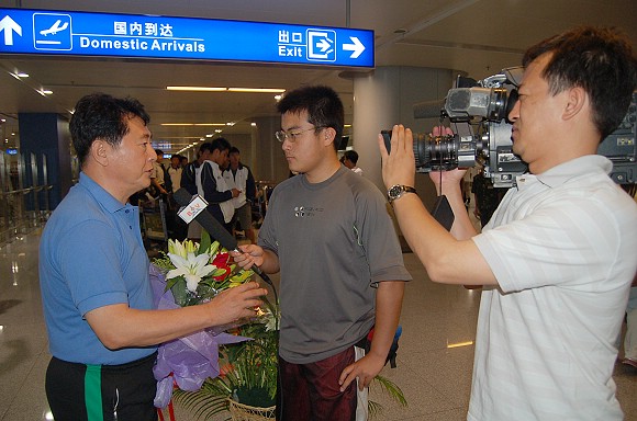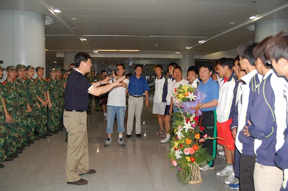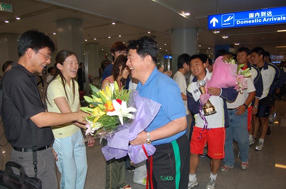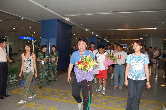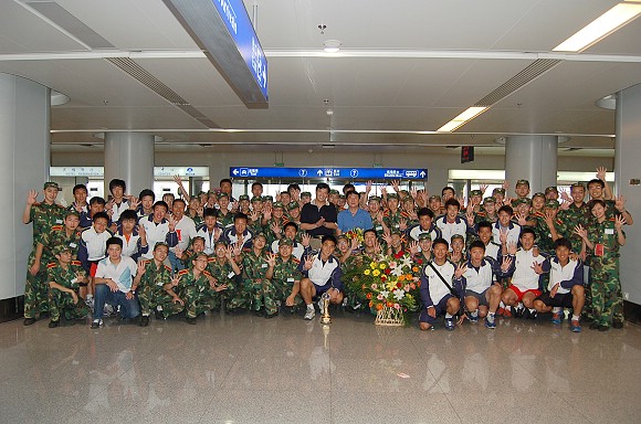 在首都機場候機廳,足球隊全體教練員和運動員受到了師生員工代表的熱烈歡迎!